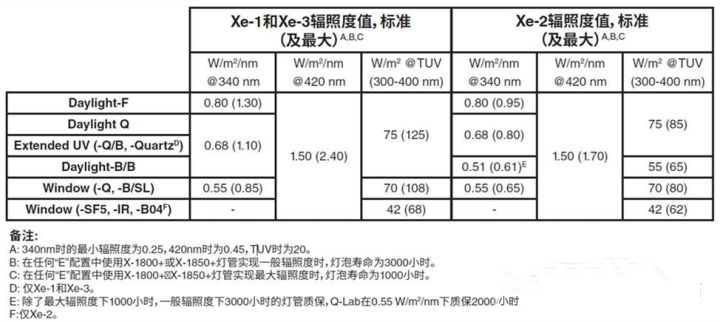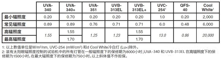 有太陽眼輻照度控制系統的設備可以設定輻照度水平。例如, 對于 UVA-340燈管, 設定0.89W/m2@340nm的輻照度和夏天正午時光強相當。為了更快地得到測試結果,紫外老化箱QUV可被設置在夏天正午光強200%條件下運行。基于不同燈管類型下表列出最高輻照度水平及一些常用的輻照度設置點。