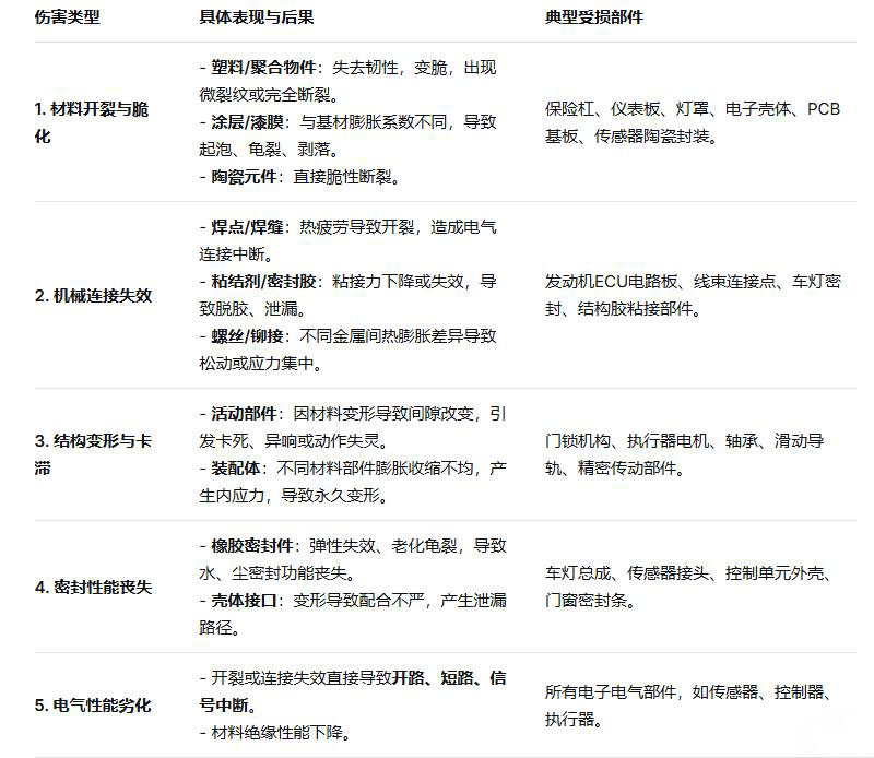 核心目的:模擬汽車配件在真實使用環境中遭遇的極端溫度驟變情況,檢驗其因材料熱脹冷縮不匹配、結構設計缺陷等導致的物理失效。