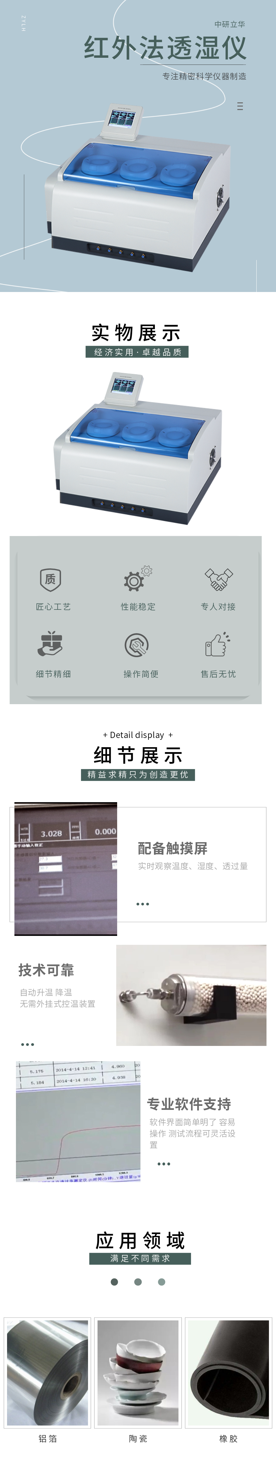 用途:測定薄膜或薄片材料的水汽透過率(量)用于塑料薄膜、復合薄膜、鋁箔、鍍鋁膜,各種片材、板材、橡膠、陶瓷,包裝容器。應用于質檢、藥檢、科研、包裝、薄膜、食品、藥品、電子等行業