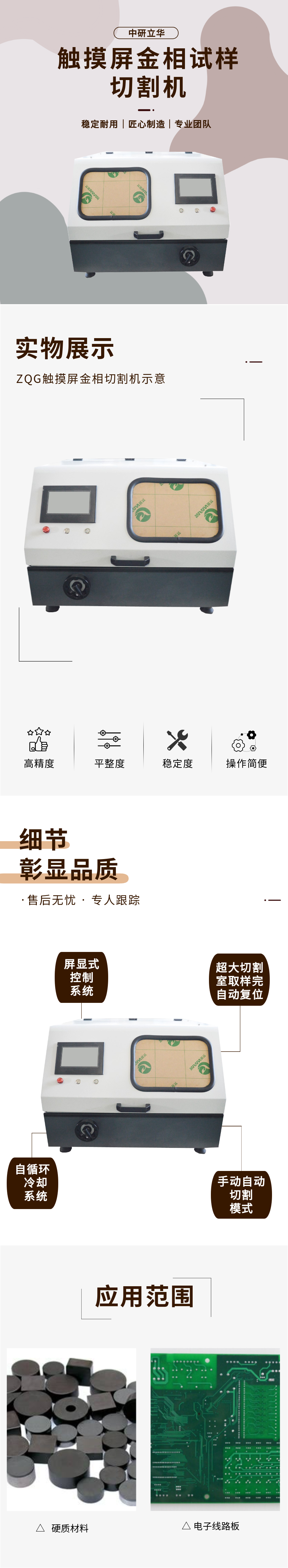 用途:本機(jī)采用高速旋轉(zhuǎn)的薄片增強(qiáng)砂輪來切取試樣。因切割不同的試樣而對切割速度進(jìn)行設(shè)定,從而提高切割試樣的質(zhì)量。該機(jī)分為手動(dòng)和自動(dòng)切割。是大專院校、工廠企業(yè)金相試驗(yàn)必備的制樣設(shè)備