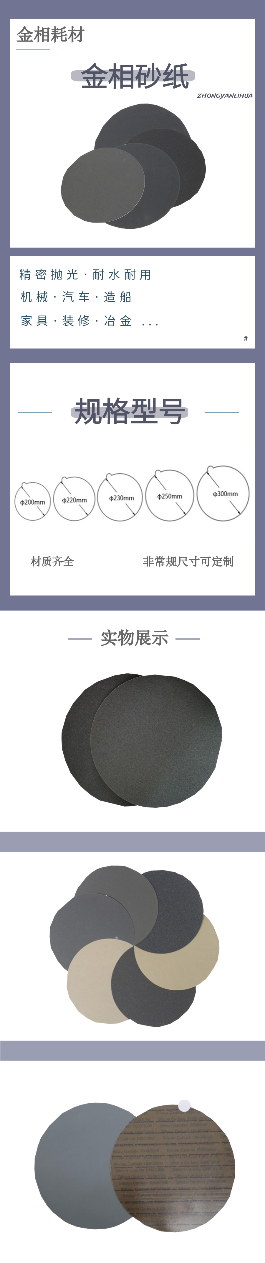 用途:專門為金相試樣制備研磨而設計的各種規格碳化硅耐水研磨砂紙,配合各種研磨機械用的圓形、條形的砂紙。黑色和有色金屬的金相試樣之粗磨、精磨、超精磨,即可干磨亦可濕磨,方便靈活。