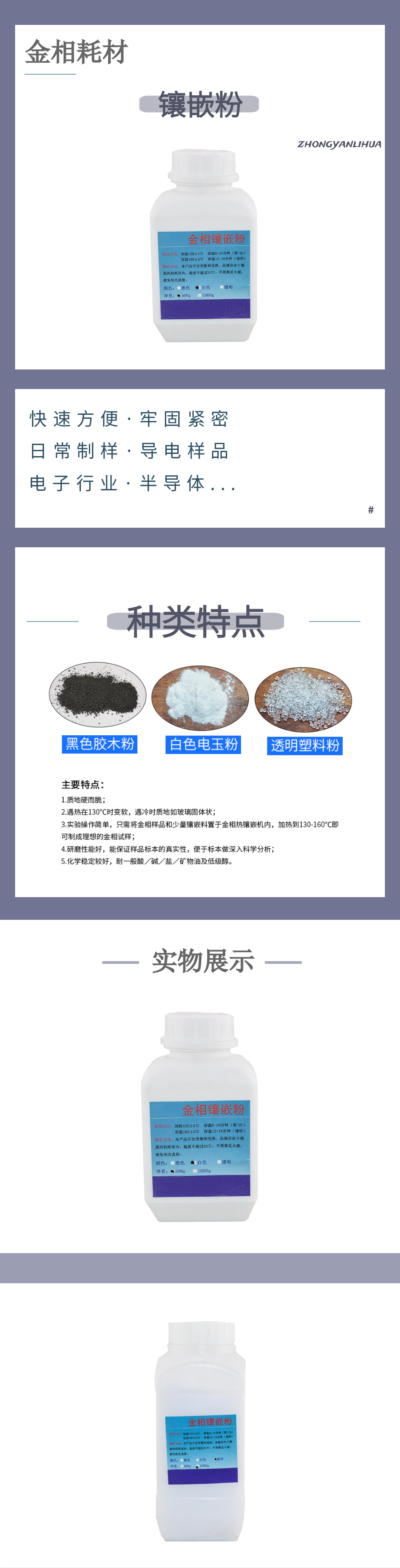用途:適用于各種不同類型的鑲嵌機,以便于測試微小,超薄工件的硬度和觀察金相組織。選用特殊材料和特殊添加劑制作而成,在鑲嵌后與樣品結合牢固緊密,與樣品邊緣不易產生縫隙。