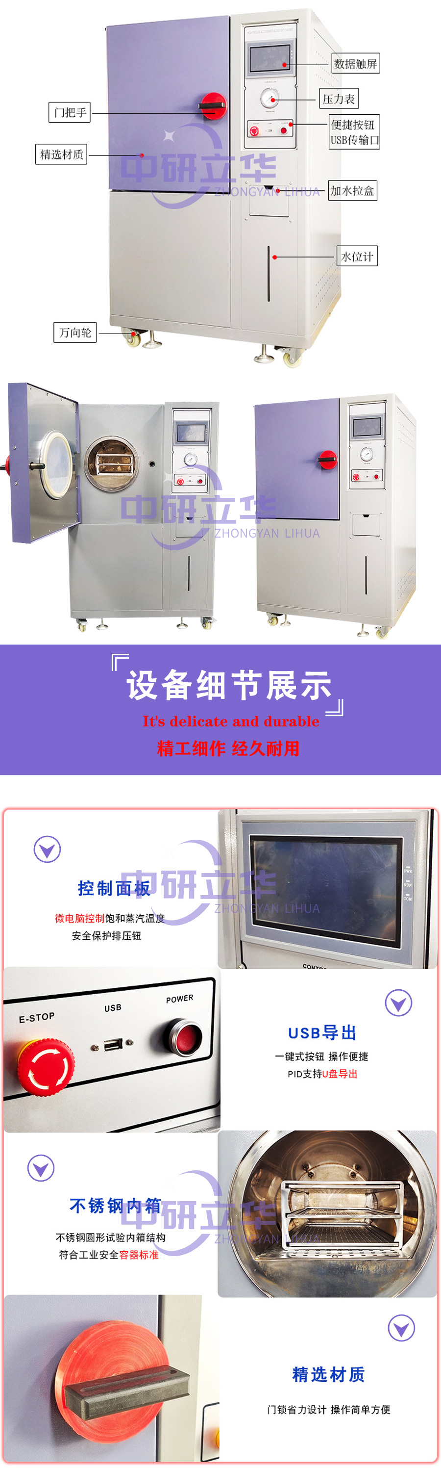 介紹:PCT高壓蒸煮試驗箱適用于國防、航天、汽車部件、電子零配件、塑膠、磁鐵行業、制藥線路板,多層線路板、IC、LCD、磁鐵、燈飾、照明制品等產品之密封性能的檢測,相關之產品作加速壽命試